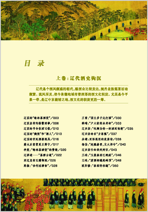 本书为随笔。作者从上百部历史文献典籍中,选取了与承德有关的皇家筵宴酒事活动记载,加以诠释和解说。通过宋辽使者、清代帝王、高官文人在今承德境域内留下的诗文,阐述了筵宴酒事在加强南北朝交往、密切辽宋皇室关系、增进民族团结等方面的积极作用,也指出皇家酒事奢华放纵的消极一面。